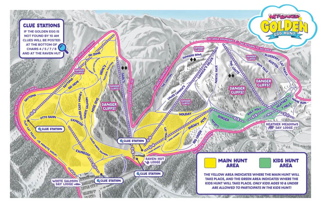 “Get your thinking caps and your eagle-eyes ready, because Mt. Baker’s Golden Egg Hunt is coming to the Mt. Baker slopes Saturday April 4th! There will be 2 separate Kids Hunts for kids ages 10 & under, plus an all-ages Main Hunt.