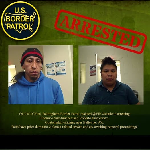 Bellingham Border Patrol agents assisted ERO Seattle in arresting two Guatemalan nationals on March 10. Fidelino Cruz-Jimenez and Roberto Ruiz-Bravo were apprehended near Bellevue, Washington. Both individuals have prior domestic violence-related arrests and are currently in removal proceedings, according to U.S. Border Patrol Blaine Sector.
